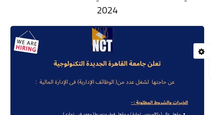 تعلن جامعة القاهرة الجديدة التكنولوجية (جامعة حكومية ( مقرها التجمع الخامس بالقاهرة الجديدة عن حاجتها لعدد من التخصصات للعمل بالإدارات التالية وبالمؤهلات المذكورة والمرفقة أدناه :- .