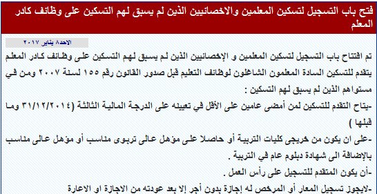 - تم افتتاح باب التسجيل لتسكين المعلمين والاخصائين الذين لم يسبق لهم التسكين على وظائف كادر المعلم يتقدم للتسكين السادة المعلمون الشاغلون لوظائف التعليم قبل صدور القانون رقم 155 لسنة 2007 ومن مستواهم الذين لم يسبق لهم التسكين