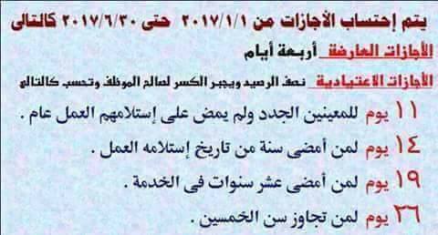 - يتم حساب رصيد إجازات للموظف من 1/1/2017 حتى 30/6/2017 بنصف رصيد الإجازة الاعتيادية والعارضة المستحقة عن العام ويُجبر الكسر لصالح الموظف( 4 ايام عارضة ).