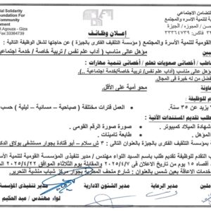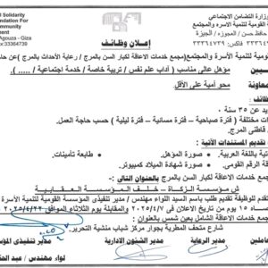 تعلن المؤسسة القومية لتنمية الأسرة والمجتمع عن حاجتها لشغل الوظائف التالية :