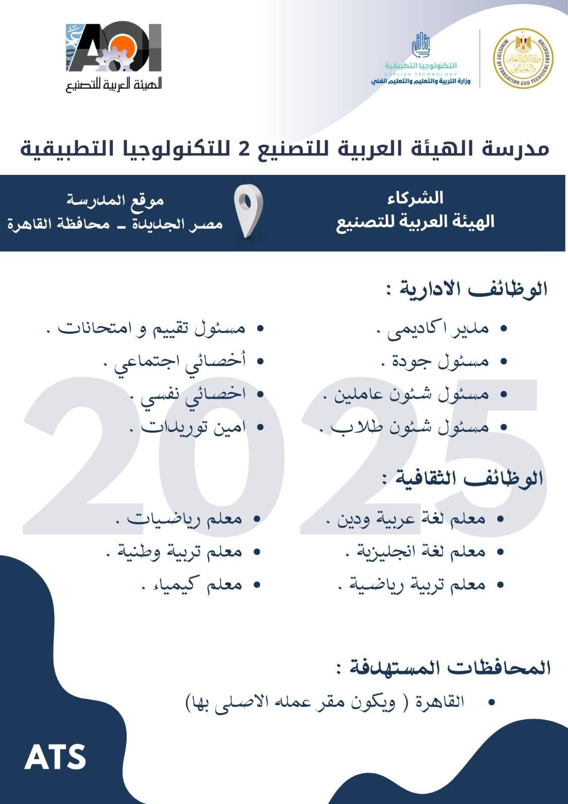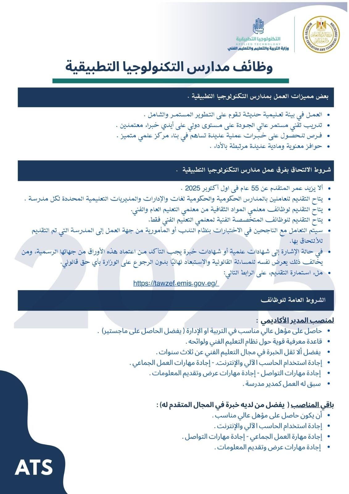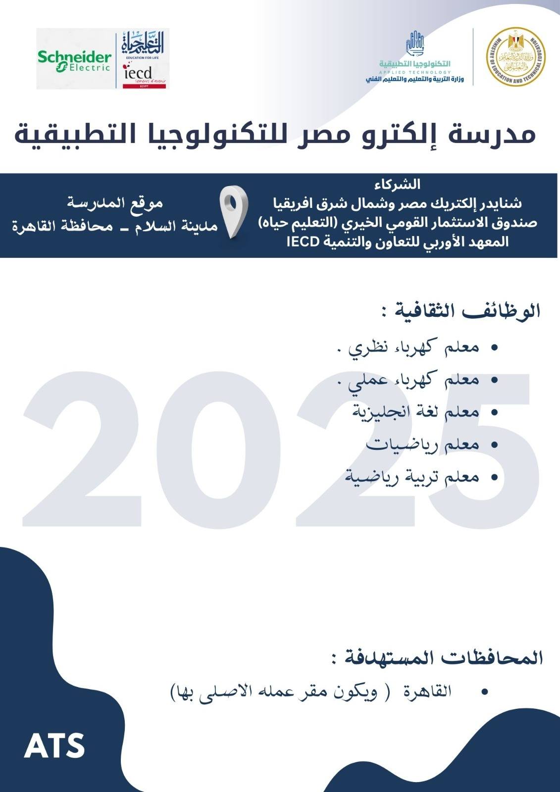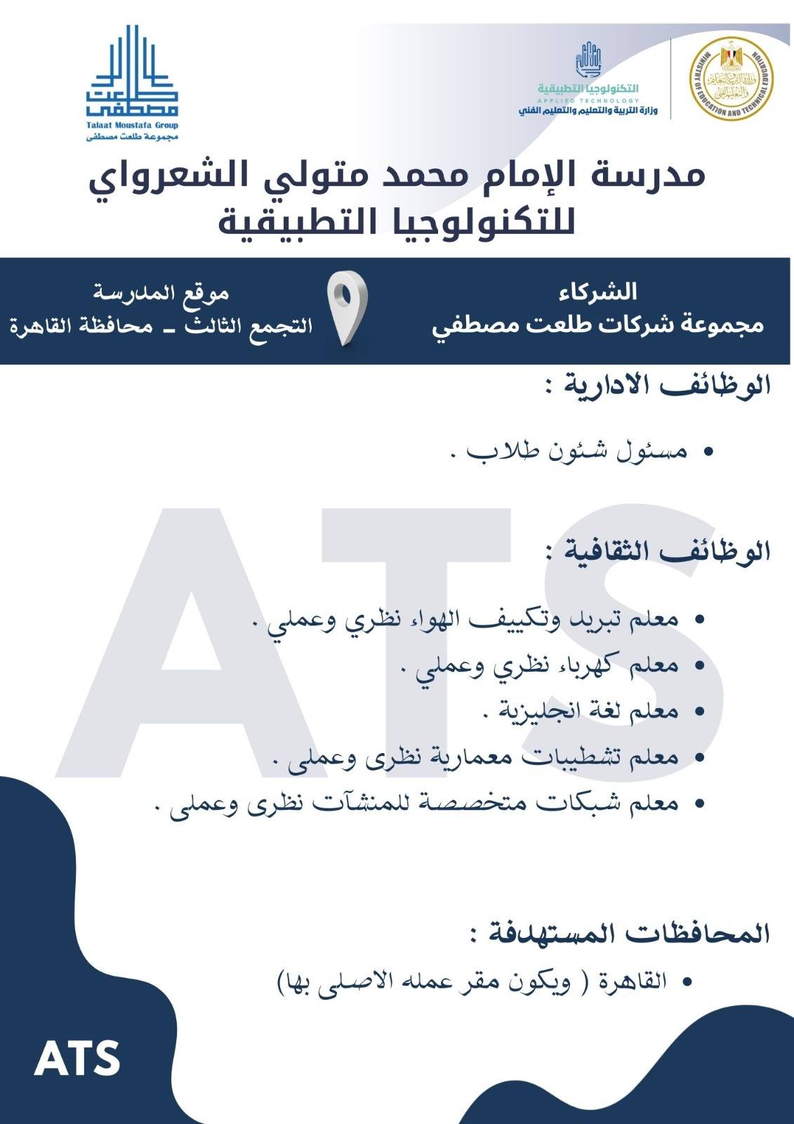 وأوضح الدكتور عمرو بصيلة، رئيس الإدارة المركزية لتطوير التعليم الفني ومدير وحدة تشغيل وإدارة مدارس التكنولوجيا التطبيقية، أن التقديم يستهدف اختيار عناصر بشرية متميزة قادرة على العمل في بيئة تعليمية حديثة تعتمد على التطوير المستمر والتدريب التقني عالي الجودة، تحت إشراف نخبة من الخبراء المعتمدين.