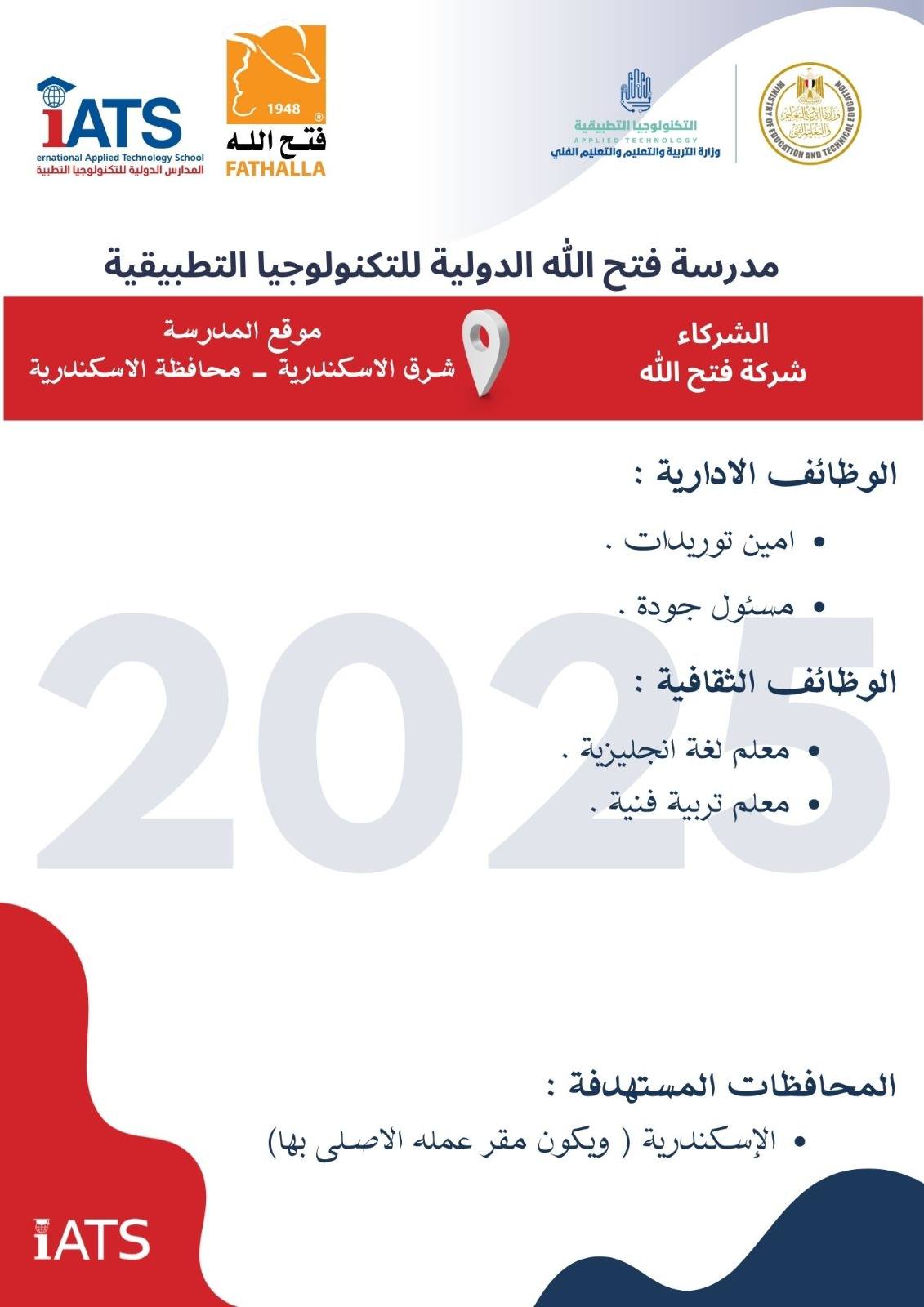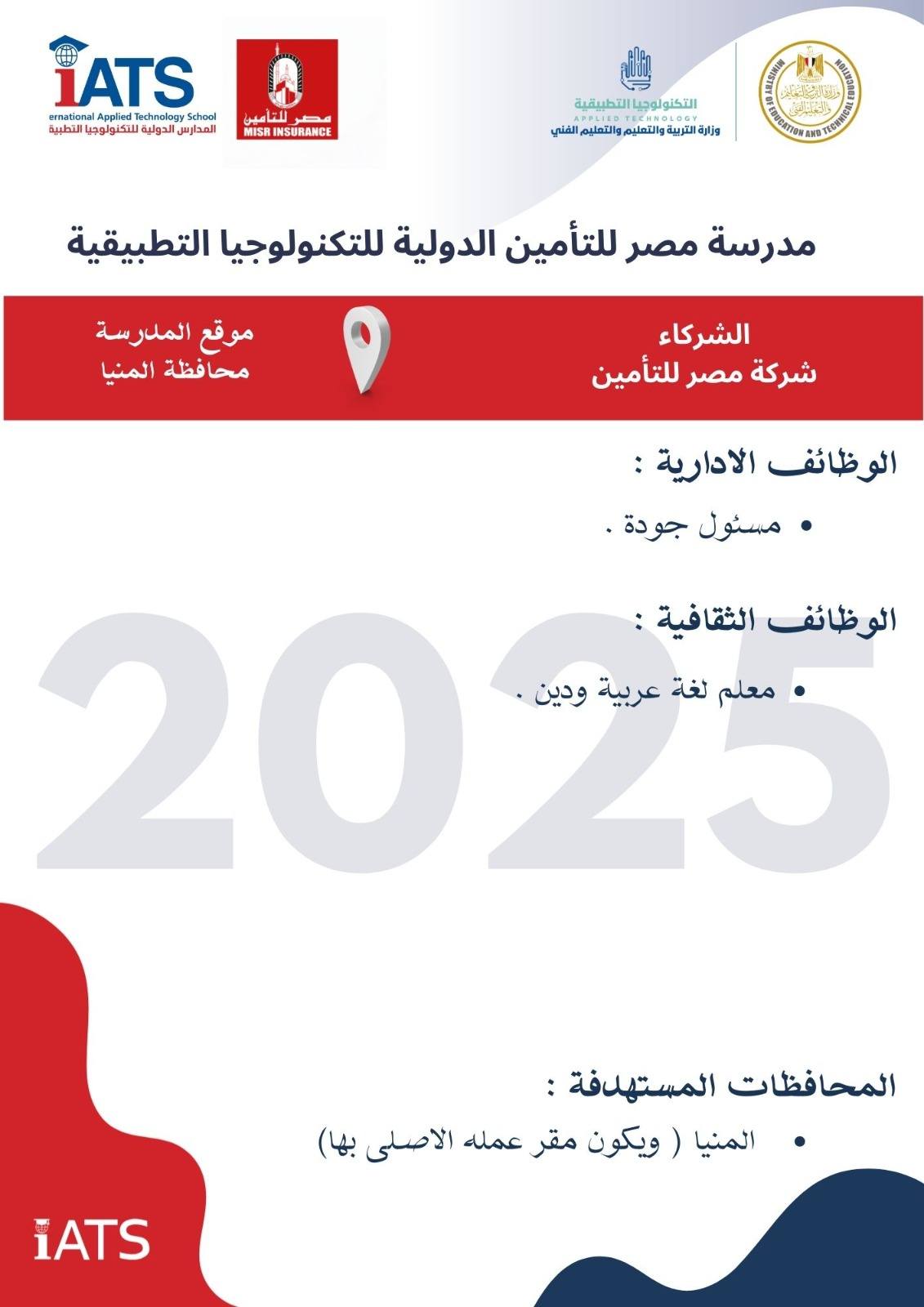 أعلنت وزارة التربية والتعليم والتعليم الفني ، فرصة للمتميزين من المعلمين والإداريين للإلتحاق بـ وظائف مدارس التكنولوجيا التطبيقية ومراكز التمييث أكدت وزارة التربية والتعليم والتعليم الفني أنها تعلن عن فتح باب التقدم للكوادر المتميزة من المعلمين والإداريين للالتحاق بفريق عمل مدارس التكنولوجيا التطبيقية ومراكز التميز ، وذلك حتى 17 سبتمبر 2025