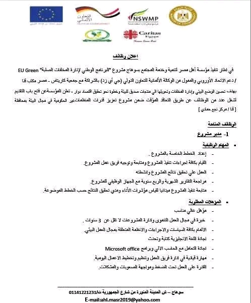 تعلن مؤسسة اهل مصر لتنمية وخدمة المجتمع بالشراكة مع جمعية كاريتاس – مصر وبدعم من الوكالة الالمانية للتعاون الدولي (Giz), وبالتعاون مع وزارة البيئة والبرنامج الوطني لإدارة المخلفات الصلبة عن فتح باب التقديم لشغل عدد من الوظائف ضمن مشروع تعزيز قدرات المنظمات غير الحكومية في مجال البيئة بمحافظة[ قنا – مركز نجع حمادي ]