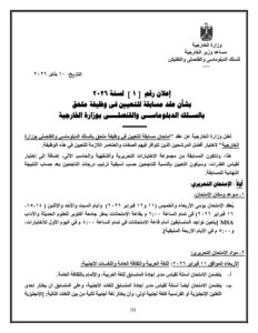 www.careerdiplo.mfa.gov.eg اعتبارًا من يوم غد السبت 10-1-2026، حيث يُطلب من المتقدمين الاطلاع على الشروط الخاصة بالتقديم قبل إجراء الامتحان.