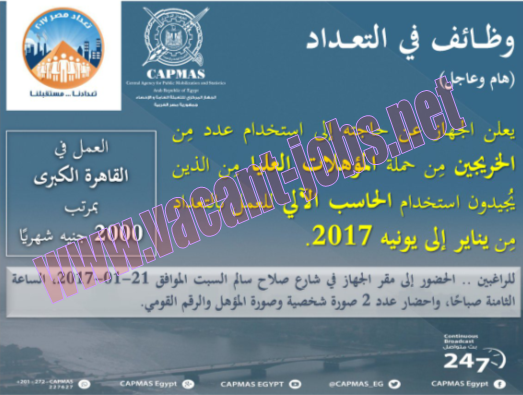 - إعلان وظائف الجهاز المركزي للتعبئة العامة والإحصاء للمؤهلات العليا بعدد من الوظائف منشور في 20/1/2017