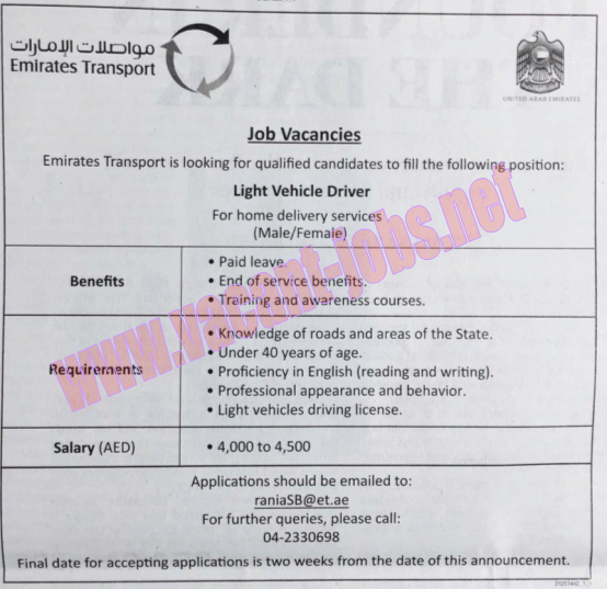 إعلان وظائف خالية – لدى شركة مواصلات الإمارات – راتب 4000 درهم – وظائف متعددة -التقديم عبر الانترنت
