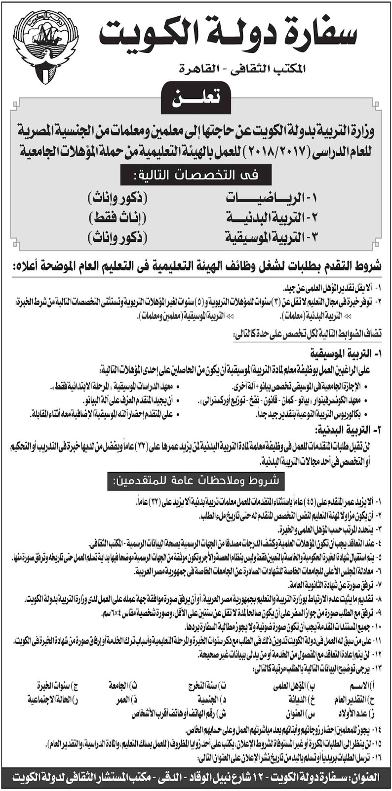 - أعلنت سفارة الكويت عن حاجتها إلى معلمين ومعلمات من المصريين للعام الدراسي 2017-2018 للعمل بوزارة التربية بالكويت فى تخصصات الرياضيات / التربية البدنية / التربية الموسيقية طبقا للشروط المعلن عنها والمنشورة بالإعلان