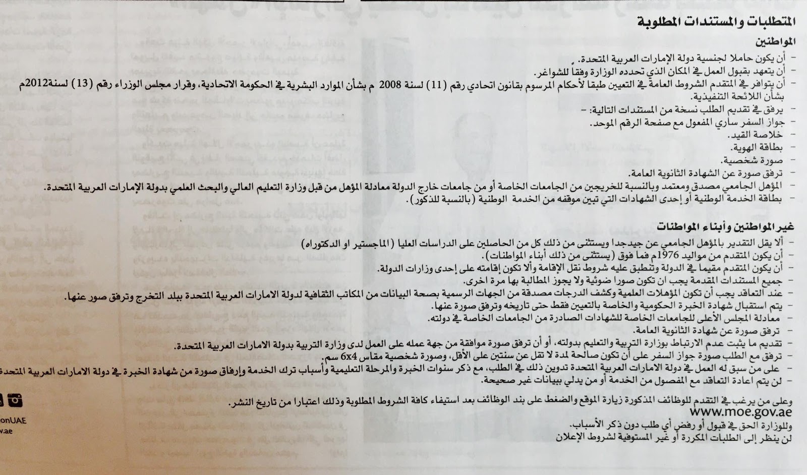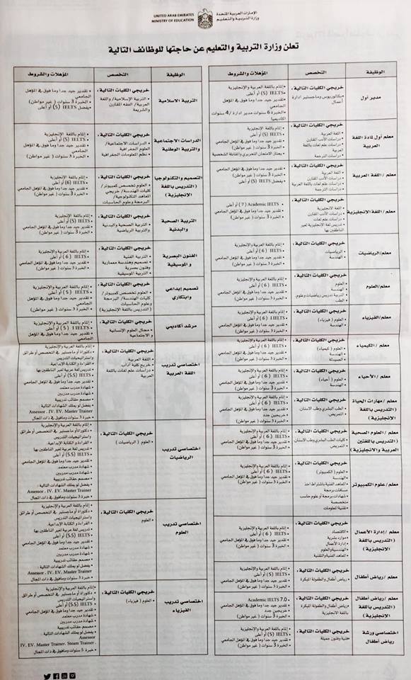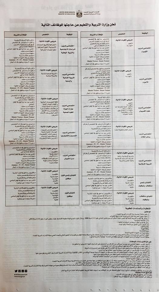 - تعلن وزارة التربية والتعليم بالامارات عن حاجتها للوظائف الاتية :