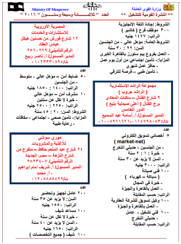 فى العدد ثلاثمائة وسبعة وستون خلال شهر ديسمبر الجارى ، يمكن الان التواصل مع معلنيين الوظائف ، حيث تحتوى اعلانات الوظائف على عدد كبير من الوظائف فى جميع التخصصات ، وظائف مهندسين ، معلمين، وفى مجال الطب،