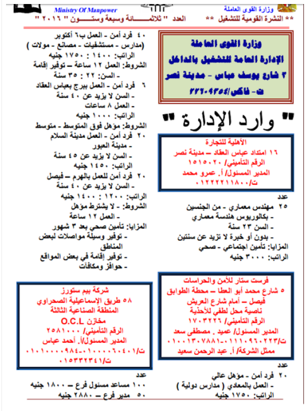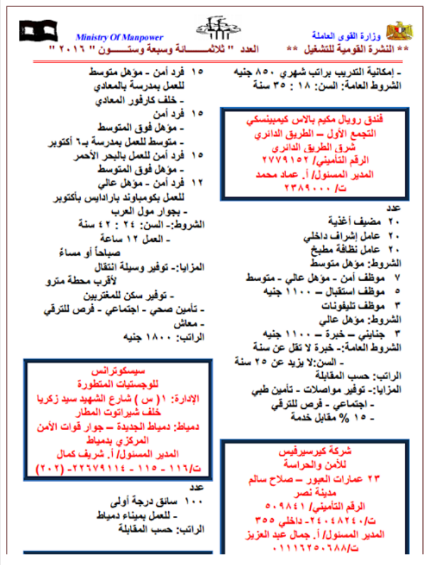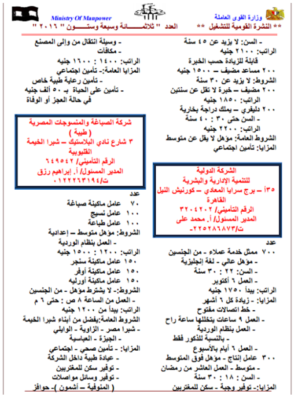 النشرة القومية للتشغيل لوزارة القوى العاملة – تطلب الآتى :-