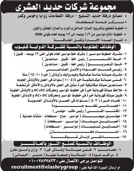 - تعلن مجموعة شركات حديد العشرى عن توفر الوظائف التالية بمصانع درفلة حديد التسلح ودرفلة القطاعات زوايا وخوص وكمر