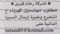 - مطلوب مهندسين كهرباء حديثى التخرج وخبرة