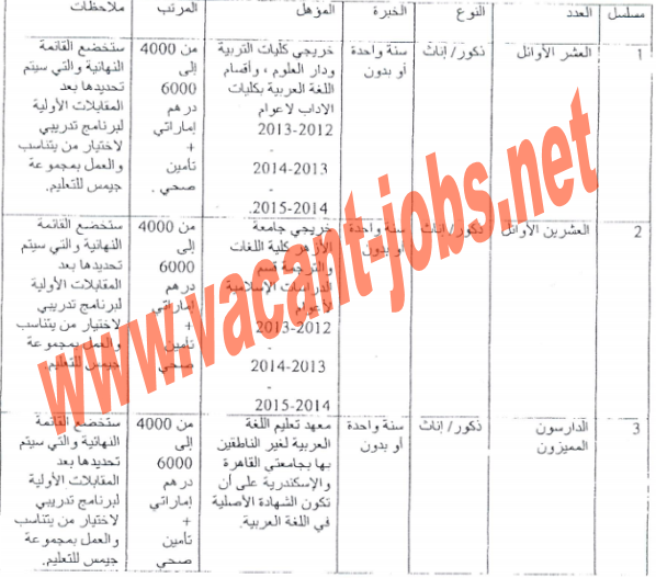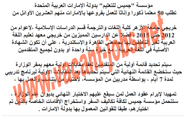 إعلان وظائف خالية لمعلمين ومعلمات بدولة الإمارات لخريجي تربية ودار علوم وآداب ولغة عربية وأزهر براتب ما بين 20 – 30 الف جنية مصري .. شاهد التفاصيل والشروط الآن منشور في 21/12/2016