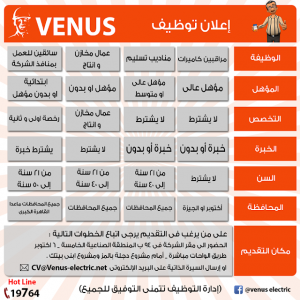 اعلان وظائف خالية بشركة فينوس للأدوات الكهربائية بكافة المحافظات مؤهل وبدون مؤهل وكافة التخصصات