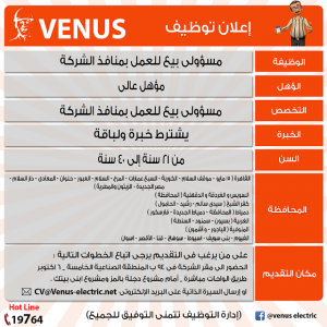 تُرسل #السيرة_الذاتية على cv@venus-electric.net أو يتم تقديم السيرة الذاتية بمقر الشركة.