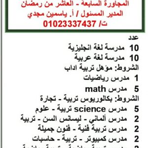 وزارة القوى العامله تعلن عن وظائف بمدارس المصرية المتكاملة التي تعلن عن حاجتها الي تعين خريجين بمختلف التخصصات