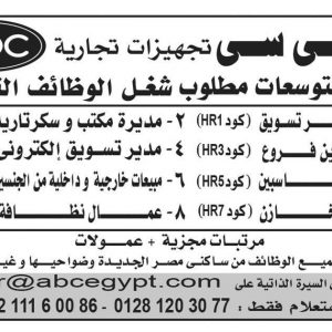 اعلنت مجموعة شركات ايه بي سي تجهزات تجارية نظرا للتوسعات مطلوب شغل الوظائف الاتية :
