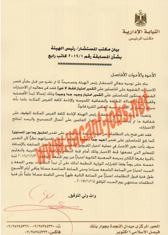 أعلنت النيابة الإدارية في بيان رسمي منذ قليل عن فتح باب الاختبارات الشفوية للحاصلين على تقديرات لتقدير امتياز وجيد جدا وجيد وذلك إعمالا لمبدأ العدالة المطلقة والشفافية الملموسة ولإتاحة كافة الفرص الممكنة