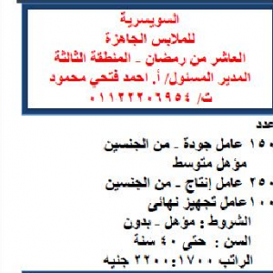 اعلنت وزارة القوي العامله عن توافر العديد من فرص العمل لدي شركة السويسرية للملابس الجاهزة والوظائف المطلوبة كالاتي :