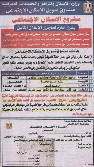 - يعلن صندوق تمويل الإسكان الاجتماعي عن فتح باب التحويل لحاجزي الإعلان الثامن بمشروع الإسكان الاجتماعي إلى المدن الجديدة التابعة لمحافظاتهم والتي يوجد بها وحدات جاهزة للتسليم وذالك بالأماكن التي شهدت زيادة في عدد المتقدمين