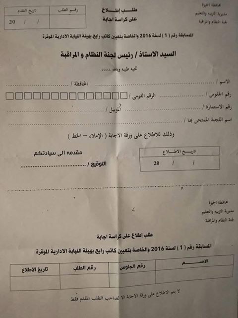 - كما يحق للحاصلين على تقدير (جيد جدًا، جيد) التظلم لتعديل تقديراتهم نظرًا لأن التقدير سوف يأخذ بعين الاعتبار في عملية اختيار المقبولين للتعيين بالوظيفة محل المسابقة للمعايير التي تضعها لجنة الاختبار وذلك أمام لجنة النظام والمراقبة بمديرية التربية والتعليم بالجيزة بمقرها الكائن بمدرسة السعدية الثانوية اعتبار من يوم الجمعة الموافق 30/12/2016 لمدة خمسة عشر يومًا وفقًا للقرارات الواردة المنظمة لذلك