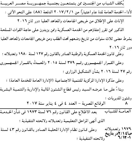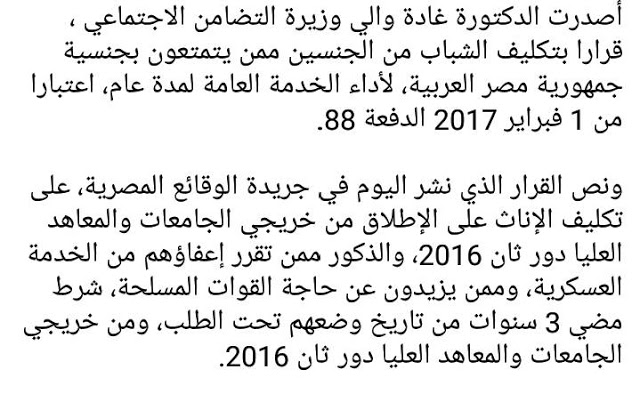 - حيث أصدرت وزيرة التضامن غادة والى قرار بتكليف الشباب من الجنسين ممن يتمتعون بالجنسية المصرية لأداء الخدمة العامة اعتبار من 1 فبراير دفعه 88