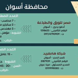 وبحسب البيان قالت “الوزارة” أن نشرة التوظيف الدورية تَصّدُر كل 15 يومًا، من خلال الإدارة العامة للتشغيل برئاسة هبه أحمد مدير عام التشغيل بالوزارة، وإعداد منى شوقي باحث أول بـ”الإدارة”، تُعلِن اليوم السبت عن فُرص عمل جديدة،مُتوفرة في 16 محافظة،هي: القاهرة ، والجيزة، والقليوبية ، وبورسعيد ، ودمياط ، والمنوفية ، والمنيا ، وسوهاج ، وأسوان ، والوادى الجديد ، والغربية ،والإسماعيلية ، والشرقية ، والفيوم ، وأسيوط ، وجنوب سيناء..و في تخصصات: إشراف داخلى ، وموظف أستقبال، ومحاسبين ، وبائعين ، ومدير محل ، ورئيس مجموعة ، وتمريض، واخصائى تمويل وإئتمان ، ومدرسين ،ومدير مالى ، وعضو فريق ، ومهندسين كهرباء وميكانيكا وإنتاج وكيميائى ،وسكرتارية ، وأعمال إدارية ، وأمين مخازن ، ومسئول تمويل ، وسائقين رخصة أولى وثانية وثالثة ،وطباخين ، ومسئول تعيينات، ومندوبين مبيعات وتوصيل، ومراقبين جودة ، وفنيين جميع التخصصات، ومشرفي إنتاج ، وأفراد أمن ، وعمال خياطة بكافة الأقسام ،وعمال انتاج ، وعمال نظافة، وتخصصات أخرى ..