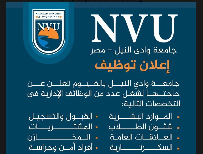 مسابقة جامعة وادي النيل مصر لخريجي أداب – تجارة- حقوق- تربية – تربية رياضية -علوم- اعلام- هندسة- دبلومات -سكرتارية -أمن مشرفين أمن وظائف إدارية
